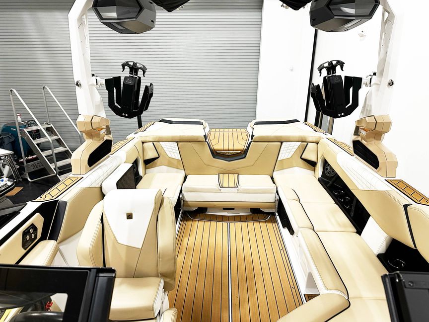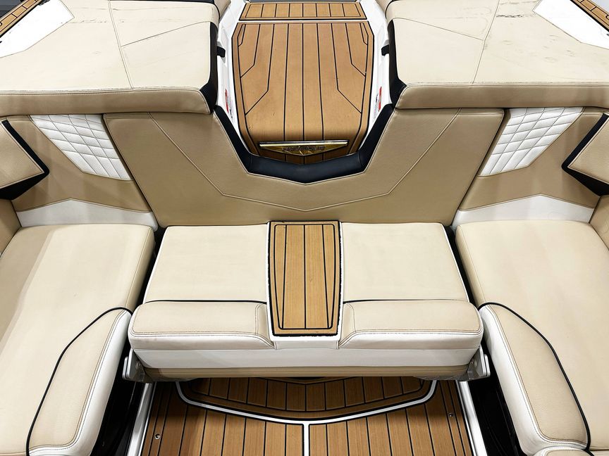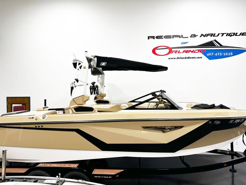 This 2025 Nautique S23 is a one-owner, freshwater-only boat with 1,157 hours and is well equipped for premium wake and surf performance. Finished in Mystic White with Sahara Sand and Centennial Black accents, it features the Flight Control Tower (actuated) with bimini top, strapless board racks, single-housing tower speakers, and a JL Audio M3 Series Premier sound system. Powered by the ZZ6 Coastal Upgrade and enhanced with supplemental ballast and a retractable ski pylon, this S23 delivers strong, consistent wakes. Additional highlights include underwater lights, docking/daytime running lights, heater with defroster, wireless charging, walk-thru air dam, mooring cover (tower up), MAPS US & Canada, and the premium MF package. No trailer and no warranty included.